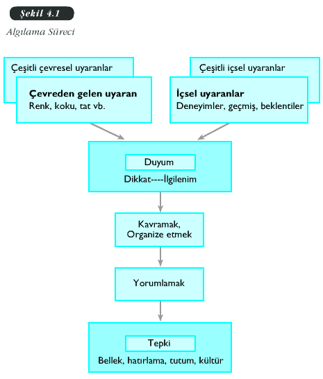 Şekilde iki tür uyaranın varlığından söz edilmektedir. Çevreden gelen fiziksel uyaranlar ve kişinin kendisi tarafından ortaya çıkarılan uyaranlar (beklentiler, güdüler, deneyimler gibi). Bir sabunun anne kokusunu anımsattığı için satın alınması, bir gülümsemenin ilk aşkı anımsattığı için bir banka reklamını sevip, reklamı yapılan bankayı seçmemiz yukarıdaki şekil dikkatle incelendiğinde daha anlamlı olacaktır.