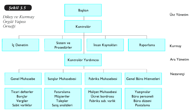 Şekil 3.5’de sadece kontrolöre bağlı bulunan bir bölümün dikey ve kurmay örgüt şeması görülmektedir. Bu yapıda örgütün tepesinden en aşağı doğru açık bir yetki ve sorumluluk akışı vardır. Kontrolör ve yardımcısı, alt düzeyde yer alan çalışanları kontrol ederler ve belli faaliyetlerden sorumlu tutulurlar. Üç Denetim, Sistem ve Prosüdürler, İnsan Kaynakları, Raporlama bölümleri kurmay hizmet vermektedir. Genel Büro Hizmetleri bölümü, bu yapıda komuta görevi yapmaktadır. Fakat kendi kayıt yönetimini, yazışmalarını vb. büro faaliyetlerini yürüten işletmenin diğer bölümlerine de bu faaliyetleri ile ilgili öneri ve tavsiyelerde bulunarak kurmay hizmet verir. Yani genel büro hizmetleri bölümü, büronun iç örgüt yapısında komuta yetkisine, büro dışındaki işletmenin genel örgüt yapısında kurmay yetkisine sahiptir.