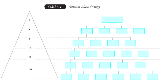 – Yönetim (ya da denetim) alanının sınırlandırılması ilkesi: Şekil 3.2’de çeşitli yönetim düzeylerinde görev yapan yöneticilerin ilişkide bulunmaları gereken ast sayısı örneklenmiştir. Bu sayının alt kademelere inildikçe arttığı görülmektedir. Örnekte en üst yöneticiye 4; ikinci kademe yöneticiye 1; üçüncü kademe yöneticiye 3; dördüncü kademe yöneticiye 4; beşinci kademe yöneticiye 6 ast bağlıdır. En alt düzeyde çalışanların sayısı böylece 288’e ulaşmıştır.