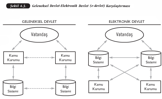 İdeal elektronik devlette, vatandaşların devletle olan bilgi alışveriş süreci geleneksel devlet yapısıyla karşılaştırılarak şematik olarak aşağıdaki Şekil 4.3′degörülmektedir.