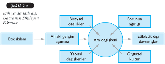 Bir kurumda ister yönetici ister çalışanlar olsun etiğe uygun davranışlar çeşitli etkenlerin ışığında gelişir. Bir davranışın ya da kararın etik değerlendirilmesini, değerlendirmeyi yapacak kişinin ahlaki gelişim sürecinde bulunduğu aşama, kişisel özellikleri ile örgütün yapısal değişkenleri, kurum kültürü ya da etik sorununun ağırlığı gibi etkenler belirler. Bu etkenler Şekil 9. 4′dedir.