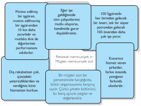 “Rank Xerox’un İşletme Müdürü Bernard Fournier, “bize göre çalışanı memnun etmek, tüketiciyi memnun etmekten çok daha önce gelmeli” deyince, salondakilerin bir bölümü önce şöyle bir irkildi. Ama sonra ne demek istediği anlaşılınca kendisine hak verildi. Yıllar boyu, tüketici memnuniyeti, şirket politikalarının odak noktasına konmuş, ama çalışanların memnuniyeti göz ardı edilmişti. Oysa asıl önemli olan, öncelikle şirket çalışanlarını memnun etmekti. Çalıştığı işyerinden memnun olmayan bir işgörenin, hizmet verdiği müşteriyi memnun etmesi beklenemezdi. “