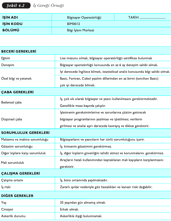 İş gerekleri başlıca iki bölümden oluşur (Bkz. Şekil 4.2). İlk bölümde işin kimliğiyle ilgili bilgiler, ikinci bölümde ise, işin gerekleri yer alır. İş gerekleri, beceri gereklerini, fiziksel gerekleri, sorumluluk gereklerini ve çalışma koşullarını içerir: