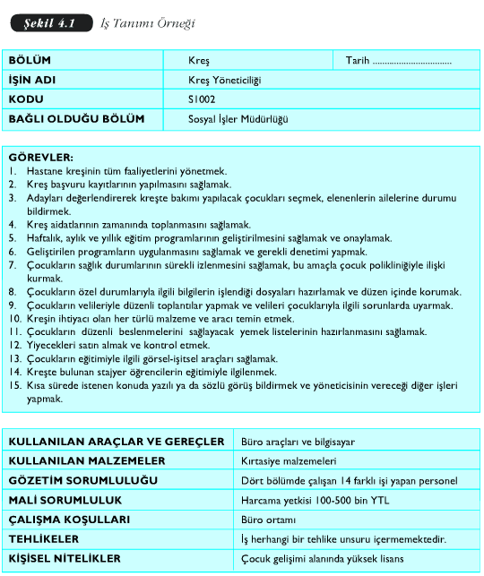 – Yapılan işbölümü: Bu bölümde iş sürecinin aşamalarını belirten ayrıntılı bir iş tanımı verilir; işe ilişkin görevler, işin gerektirdiği sorumluluklar, işin diğer işlerle ilişkisi, örgüt şemasındaki yeri, sağlanan ve kabul edilen gözetim belirtilir. İşin yapılması sırasında ne tür makine, araç ve malzeme kullanıldığı (sürekli veya geçici olarak) bu bölümde açıklanır. İşin yapıldığı sosyal çevreyle ilgili bilgiler ile fiziksel çalışma koşulları ve işin içerdiği tehlikeler de iş tanımının bu bölümü içinde yer alır.