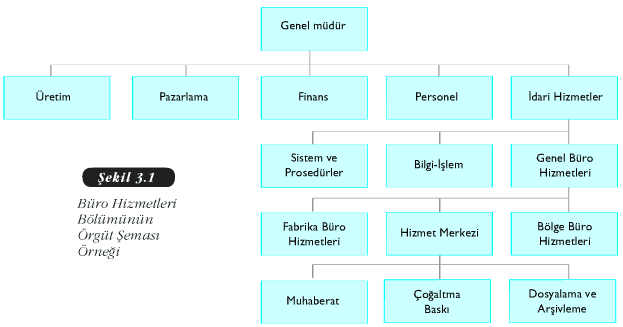 Şekil 3.1’deki örgüt şeması örneğinde, büro faaliyetlerinin yönetilmesi için ayrı bir bölüm oluşturulduğu görülmektedir. İdari hizmetlere bağlı sistem ve prosedürler bölümünde, tüm işletmedeki büro sistemleri, prosedürleri ve yöntemleri tasarlanır, iyileştirilir ve yerine getirilmesi sağlanır. Tüm büro makineleri ve donanımlarıyla, en etkin fiziksel iş ortamını yaratacak büro yerleşimi hakkında araştırmalar yapılarak önerilerde bulunulur. Büroda hizmet ve kalite standartları belirlenir. Her türlü büro israfını ortadan kaldırmak için iş basitleştirmesi programları uygulanır. Böylece işletmenin tümü için etken ve verimli büro hizmeti sağlanır.