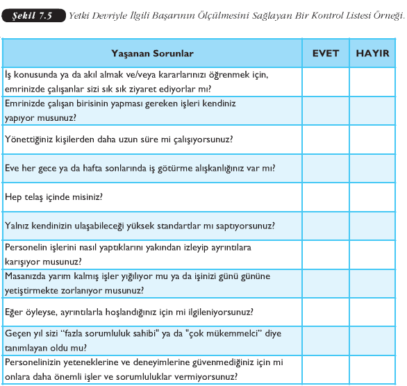 Halbuki yöneticiler, yetki devriyle hem kendi iş yüklerini hafifletirler, ayrıntılarla uğraşmaktan kurtulurlar, hem de astlarının bu işi yaparak öğrenmelerine olanak sağlarlar. Ancak çoğu yönetici bu konuda bazı yetersizliklere sahiptir. Şekil 7.5’de bir kontrol listesi yer almaktadır. Bu listede yer alan sorular, yöneticilerin bu konuda ne kadar başarılı oldukları hakkında fikir edinmelerini sağlayacaktır.