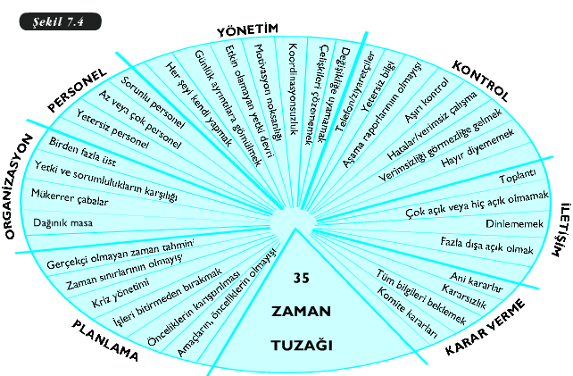 Yöneticilerin günlük programlarını uygulamadaki başarısızlıklarının en yaygın nedeni, yaptıkları çalışmaların başkaları tarafından bölünmesidir. Bu bölünmelerin nedenleri de genellikle telefonlar ve ziyaretçilerdir. İşyerlerine doğal olarak nezaket ziyaretleri yapılmalıdır. Ama bu nezaket, çalışmayı engelleyecek, düşünceleri ve çabaları ortadan kesecek kadar ileri gitmemelidir. Bu tür engellemeler kişiyi şaşırttığı gibi, işin geciktirilmesinden dolayı moral bozukluğuna da neden olur. Bütün engeller, aslında her zaman, birer zaman tuzağı olmasa da, yarattığı etki bakımından zaman tuzağıyla aynı anlama gelirler. Bir şey insana zaman kaybettiriyorsa, daha önemli başka bir iş yapılamıyor demektir. Şekil 7.4’de yöneticilerin sık sık karşılaştıkları zaman tuzakları görülmektedir. Zaman tuzaklarının oluştuğu yerler, yöneticinin görevine göre sıralanmıştır. Örneğin, yöneticilerin personelle ilgili işler nedeniyle çalışmalarının sürekli bölünmesinin temel nedenleri sorunlu, yetersiz ya da sayıca az veya çok personeldir. Zaman kazandıran en etkin iletişim araçlarından biri olan telefon, aynı zamanda en büyük zaman tuzaklarından biridir. Özellikle de yöneticiler, telefonun ve beklenmeyen ziyaretçilerin neden olduğu zaman kayıplarından şikayet ederler.
