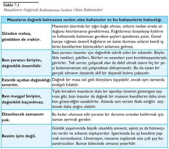 Masaların dağınıklığına izin verilmemelidir. Oysa yapılan araştırmalar dağınık masa hastalığının yöneticilerin yüzde 95’inde bulunduğunu göstermektedir. Yöneticilerin çoğunun gerekçesi de, işlerini unutmak istemediklerini, gözlerinin önünde durduğu zaman daha iyi olduğunu düşünmeleridir. (Bkz. Tablo 7.1.) Doğal olarak da bu yöneticilerin gözleri ne zaman masalarının üzerindeki kağıtlara takılsa, o işleri hatırlayarak dikkatleri dağılacaktır. Kağıt yığını büyüdükçe, en altlarda neler olduğunu hatırlamaları mümkün olamayacağı için, bu kez de kağıtları karıştırmaya başlayacaklar, böylece hem kaybolan kağıtları, hem de unutmak istemedikleri işlerle ilgili olan şeyleri arayarak zaman kaybedeceklerdir. Bazı yöneticiler de, başkaları onların çok fazla çalıştıklarını düşünsünler diye sadece masalarını değil, odalarının her yerini dağınık tutarlar. Ancak hiç kimsenin böyle bir ortamda değil çok çalışmasının, yürümesinin ya da oturacak bir yer bulmasının mümkün olmayacağını herkes bilir. Bu tür insanlar böyle yaparak sadece kendilerini kandırmaktadırlar.