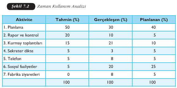 Şekil 7.2’de bir yöneticinin zamanını nereye harcadığıyla ilgili tahminlerinin, planının ve zaman çizelgesi tutularak saptanan gerçekteki zaman kullanımının nasıl olduğunu gösteren bir örnek yer almaktadır. Bu örnekte yönetici, planlamayla ilgili işlere zamanının yüzde 50’sini ayırdığını tahmin etmektedir. Aslında zamanının yüzde 40’ını ayırması gerektiğini planlamış olmakla birlikte, yapılan analiz sonucunda sadece yüzde 30’unu ayırdığı ortaya çıkmıştır. Görüldüğü gibi bir kişinin bazı işlere ayırdığını düşündüğü zamanla gerçekten ayırdığı zaman arasında önemli farklılıklar olabilmektedir. Bunun anlaşılmasından sonra bu kişinin, hangi işe ne kadar zaman ayırması gerektiğine daha dikkatli bir şekilde karar vermesi mümkün olabilecektir.