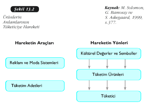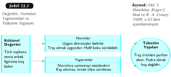 Kültür, değer, norm, ritüel gibi kavramların tüketim davranışlarımızı etkilediğini artık biliyoruz. Çünkü hem değerler hem de normlar toplumsallaşma süreci içinde öğrenilir ve bunların şekillendirdiği davranışlarımız çevremize bizim nasıl bir birey olduğumuzu anlatır. Kültürel değerler, normlar, yaptırımlar ve tüketim yapılarının etkileşimi Şekil 13. 1′de görülmektedir.