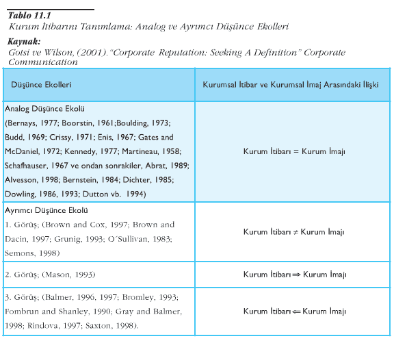 Tablo 1′de de görüleceği gibi, kurumsal itibar tanımının yıllarca pazarlama akademisyenlerini ve uzmanlarını bir firmanın kurumsal itibarıyla kurumsal imajına yükledikleri ilişkiye dayanan iki ana ekole böldüğünü göstermektedir. Bunlardan biri kurumsal itibarın kurum imajıyla aynı anlama geldiğini savunan analog düşünce ekolü, ikincisi ise bu iki terimin birbirinden farklı olduğunu, fakat yazarların çoğuna göre birbiriyle ilgili olduğunu savunan ayrımcı düşünce ekolüdür. Ayrımcı düşünce ekolüne göre bir firmanın kurumsal itibarı ve yansıtılan kurumsal imajı arasında dinamik ve iki yönlü bir ilişki olduğu fikrini desteklemektedir. Bu çalışmada ifade edilen karşılıklı ilişkilerin, ileriki araştırmalarda kurumsal itibarın bir firmanın sadece etkileyici logolardan ve planlı iletişim çalışmalarından etkilenen ve bu şekilde yönetilebilecek durağan bir unsuru olmadığı fikrini desteklemesi gerekir. Bir kurumun hissedarlarıyla sahip olduğu kurumsal itibarının da kurumun yansıtılan imajından – davranışından, iletişiminden ve sembolizminden – etkilenen ve bu imajı etkileyen dinamik yapılar olarak ele alınması gereklidir.