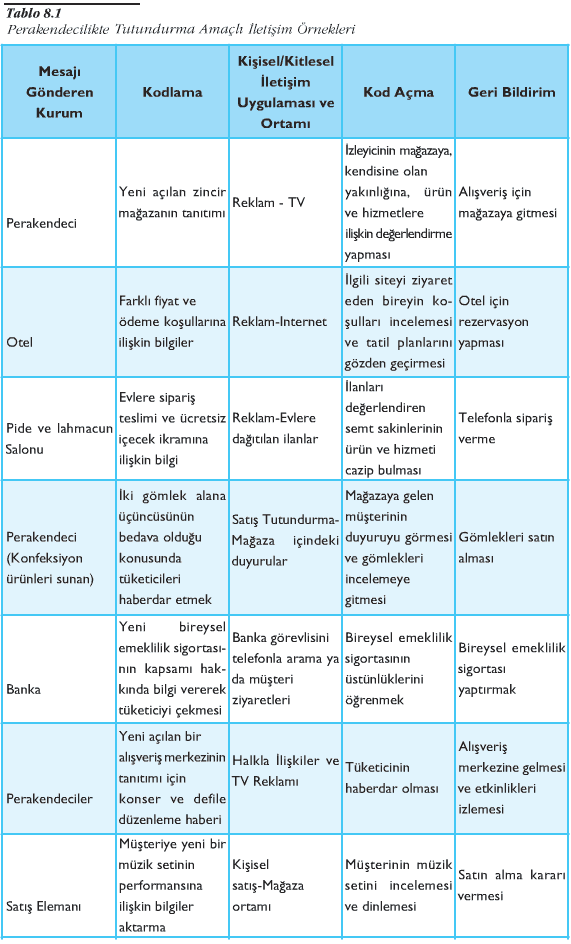 Perakendecilikte iletişim çabalarının akışını aşağıdaki şekil yardımıyla değerlendirebiliriz. Şekilde görüleceği gibi iletişimin iki tarafı vardır: kaynak ve alıcı. İletişim sürecinde mesajı yaratıp alıcıya gönderen taraf, mesajın kaynağı olarak tanımlanır. Kaynak bu süreçte perakendecidir, ancak unutulmamalıdır ki bazen üretici ve perakendeci ortak tutundurma çabalarına girebilirler. Perakendeci, ürün özellikleri ve çeşitlerinden marka imajına değin pek çok konuda tüketicilere, çeşitli araçlar yardımıyla bilgi aktarabilir. Örneğin; web sitesinden tüketicileri haberdar etmek ve onları siteye çekmek için iletişim çabalarına girişebilir. Bu bilgiyi görüntüler, kelimeler, semboller vb. ‘ni kullanarak mesaja dönüştürür. Bir kitlesel iletişim aracı olan televizyon reklamı aracılığıyla hedef kitleye aktarabilir. Hedef kitle televizyon reklamı aracılığıyla kendine ulaşan mesajı, algıları, tutumları ve değerleri aracılığıyla yorumlar. Eğer mesaj istenen etkiyi oluşturduysa, siteyi ziyaret ederek ya da mağazaya giderek geri bildirimde bulunur.