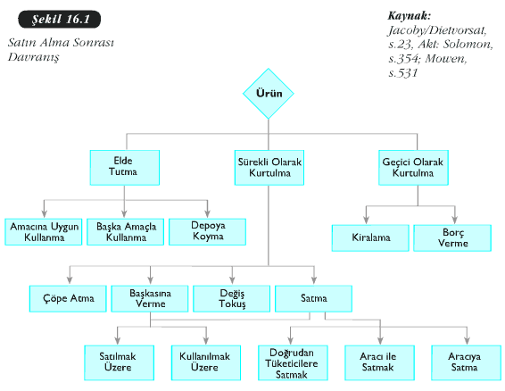Şekil 16. 1 tüketicilerin bir ürünü satın aldıktan sonra gerçekleştirdikleri eylemleri özetlemektedir. Buna göre tüketici bir ürünü satın aldıktan sonra, doygunluk derecesine göre üç farklı davranışa yönelmektedir. Üründen yeterince doygunluk sağladığına inanıyorsa, alım amacına uygun olarak ürünü tüketmekte ya da kullanmaktadır. Alım amacına uygun kullanım gerçekleşmiyorsa, ürünü başka bir amaçla kullanmaya yönelmekte ya da ürünü kullanmayarak bekletmektedir. Bir öğretmenin çalışmalarında kullanmak üzere satın aldığı bir masaüstü bilgisayar, bu amacı gerçekleştirecek özelliklere sahipse amaca uygun biçimde kullanılabilecektir. Ancak bu bilgisayarın taşınamaması nedeniyle başka yerlerde kullanılamaması öğretmen için bir olumsuzluktur.