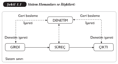 Şekilde geribesleme verilerinin denetime akışı ve sonuçta denetimin diğer elemanlarla veri akışı kesikli çizgilerle gösterilmektedir. Bu kesikli çizgilerle gösterilen ilişkiler geribesleme ve denetimin rolünü vurgulamaktadır. Geribesleme ve denetimin rolü ise diğer elemanların girdileri çıktıya dönüştürerek amacına ulaşmasını sağlamaktır.