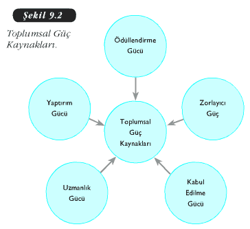 Toplumsal güç kaynakları beşe ayrılarak incelenir (French Jr. R. P/B. Raven, s. 150-167′den akt. : (Hanna/Wozniak s. 395-400). Bunlar: Ödüllendirme gücü, yaptırım gücü, zorlayıcı güç, kabul edilme (tanınma) gücü, uzmanlık gücüdür. Şekil (2) Bu güç kaynaklarını toplu olarak göstermektedir.