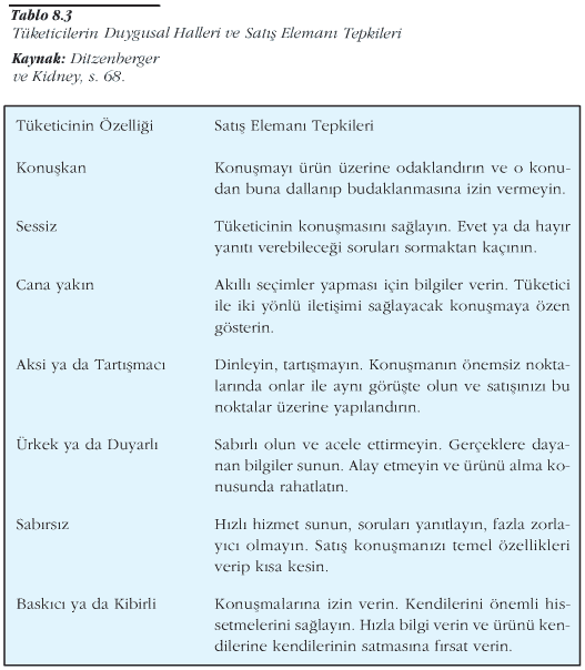 Alışveriş yapmanın duygularımızı harekete geçirdiğinden söz ettik. Tüketicilerin belirli duygu halleri ile alışverişe çıkmaları da olasıdır. Tüketicilerin ruh halleri hızla değişebilir. Mutlu ve neşe ile alışverişe başlamış bir tüketici, kendisi ile ilgilenen satış elamanına, ürünün özelliklerine, değerlerine bağlı olarak huzursuz, baskıcı ya da ağlamaklı olabilir. Aşağıda bazı duygusal hallere (mood) sahip tüketicilere başarılı bir satış elemanının verebileceği tepkileri bulacaksınız.