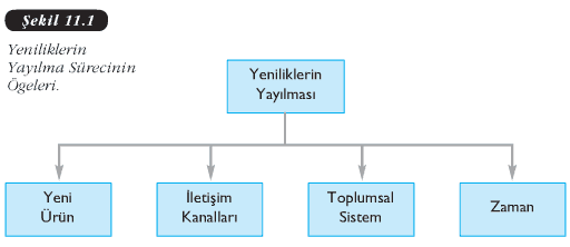 Şekil (1) ‘de de görüldüğü gibi, yeniliklerin yayılma sürecinin dört ögesi bulunmaktadır: Yeni ürün, iletişim kanalları, toplumsal sistem ve zaman. Yeniliklerin yayılma sürecinin ögelerine kısaca değinelim.