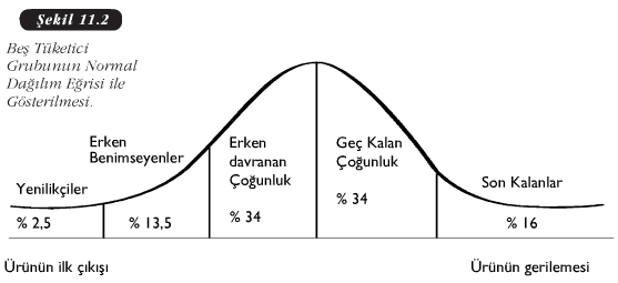 Şekil (1) , Rogers’in beş tüketici grubuna göre geliştirdiği modelde, normal dağılım eğrisi ile tüketicilerin dağılım oranları göstermektedir. Daha sonra başka araştırmacılarca da geliştirilen bu eğri, yavaş yayılan yenilik ürünlerinde daha yayvan, hızlı gelişen yenilik ürünlerinde ise ters U biçiminde oluşmaktadır.