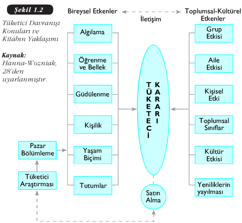 Bu kitapta tüketici davranışları üzerindeki etkenleri iki ana bölümde ele alacağız. Bunların yanı sıra, tüketici davranışı ve pazarlama stratejisi ve tüketicinin karar verme süreci ayrı bölümler olarak incelenecektir. Tüketici davranışı üzerinde etkili olan etkenler ve bunların kitaptaki inceleme biçimi Şekil 1. 1′de gösterilmektedir. Şekilde tüketici davranışını etkileyen iki ana grup etken yer almaktadır. Bunlar, bireysel (psikolojik) etkenler ve toplumsal- kültürel (sosyokültürel) etkenlerdir. Birinci ana grupta yer alan bireysel etkenler algılama, öğrenme ve bellek, güdülenme, kişilik, yaşam biçimi, ve tutumlardır. İkinci ana grupta yer alan toplumsal- kültürel etkenler ise grup etkisi, aile etkisi, kişisel etki ve yeniliklerin yayılması, toplumsal sınıflar, kültür etkisidir. Çevredeki bu etkenlerle tüketici arasında bir bilgi akışı vardır. Kişisel ya da kitlesel olan bu bilgi akışı tüketici seçiminin olası biçimini ve yönünü belirlemektedir. Bu akış her iki ana etken grubu için de geçerlidir ve karşılıklı etkileşim söz konusudur.