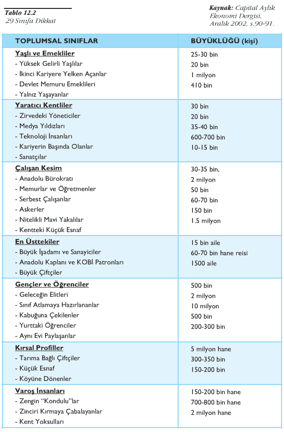 Bugüne kadar gerçekleştirilen sınırlı sayıda araştırmada, dünyanın her yerinde olduğu gibi Türkiye’de de özellikle gelir, statü gruplarına dayalı sınıflandırmada genel kabul görmüş ve yaygın kullanılan boyutlardan birisi olmuştur. Türkiye’de yapılan en kapsamlı çalışmalardan biri Zet-Nielsen araştırma şirketi tarafından toplumu, en üst düzeyden en alt düzeye doğru A, B, C1, C2, D ve E şeklindeki gruplandırmadır. Toplumsal sınıflara ilişkin bir diğer çalışma, Capital Dergisinin 2002 yılında yayınladığı Türkiye’deki toplumsal sınıflar ve yaşam biçimleri analizidir. Capital Dergisi çalışmada Türkiye’de yedi temel toplumsal sınıf kategorisi belirleyerek, bunların altında öne çıkan 29 sınıfa işaret etmekte ve her bir sınıfın özelliklerini ortaya koymaktadır (Tablo 2) .
