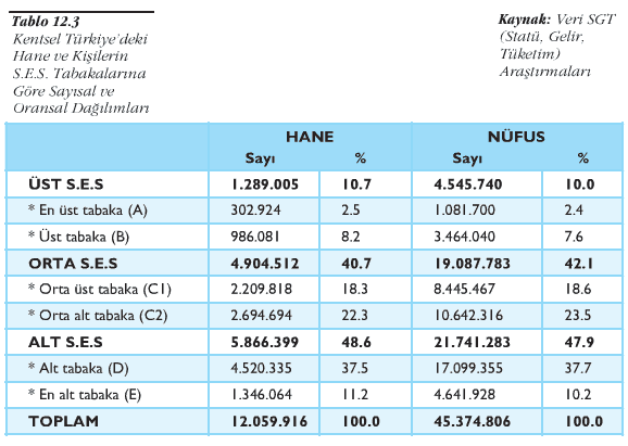 Tablo (3) ise Veri SGT’nin, Türkiye’de Kentsel Türkiye Araştırmaları Dizisi 3 (2004-2005) çalışması ile hane ve nüfusa dayalı olarak sosyoekonomik sınıfların oransal dağılımını göstermektedir. Veriler, Türkiye’de S. E. S. tabakalarına göre Türkiye’de hane ve nüfus açısından en büyük yüzdesel payı D ve E tabakalarından oluşan alt grupların oluşturduğunu göstermektedir.