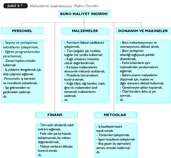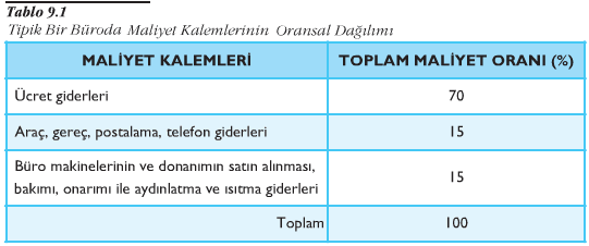 Bürolarda genellikle hesaplanabilir maliyet kalemleri, büro personelinin maaş ve ücret giderleri; büro binasının kira, satın alma, aydınlatma, ısıtma, temizlik, bakım ve onarım giderleri; büro makineleri ve diğer donanımların satın alma, kiralama, amortisman, bakım ve onarım giderleri; malzeme giderleri ve iletişim giderleridir. Tipik bir büroda bu maliyet kalemlerinin oransal olarak dağılımı Tablo 9.1’de görüldüğü gibidir.
