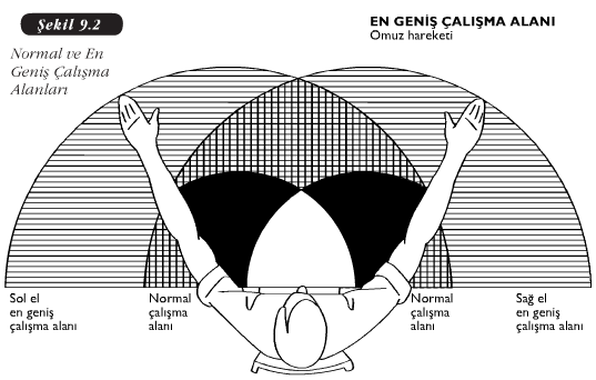 Masa üzerinde sağ ve sol elin normal çalışma alanı; sağ ve sol elin ve dirseğin birlikte çizdiği daireye göre belirlenir. Bu ölçüte göre işgören çalışma alanında her iki elini de kolayca kullanabilir. En geniş çalışma alanı ise, omuzun eksen olarak kabul edilip, el ve kolun çizdiği dairedir. Şekil 9.2’de bir personelin normal ve en geniş çalışma alanları görülmektedir.