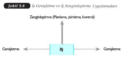 – İş zenginleştirme: İş zenginleştirme, faaliyet alanının dikey yönde genişlemesini sağlayan bir tekniktir. Bu teknikle farklı nitelikteki fonksiyonel iş grupları bir bütün haline getirilir. Böylece faaliyet alanı dikey alarak genişletilmiş ve farklı hiyerarşik düzeydeki faaliyetler (genellikle de iş planları yapma, problem çözme ve amaç belirleme) bir kişide toplanmış olur. Temel amaç, çalışanların kendilerini denemeleri için daha fazla olanak, gelişmiş becerilerini kullanmaları için daha çok fırsat, fikirleriyle katkıda bulunmak için daha çok şans vererek onlar için işlerini çekici hale getirmek ve motive etmektir. Örneğin, işi sadece içerik ve şekil olarak başkaları tarafından tasarlanmış yazıları bilgisayarda yazmak olan bir memura bu yazıların planlanmasından yazılıp bitirilmesine kadar tüm aşamalarını yerine getirmesi istendiğinde söz konusu olur. İş genişletme ve iş zenginleştirme şematik olarak Şekil 9.8’deki gibi gösterilebilir.